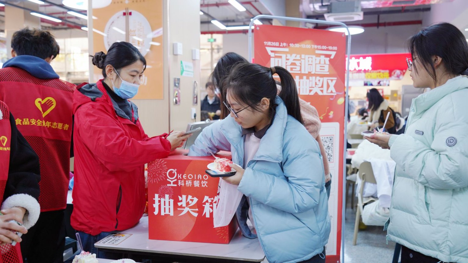 问卷互动与抽奖环节同样气氛热烈,师生通过线上扫码填写有关食材新鲜度与餐具洁净度的问卷后,即可参与抽奖。毛绒公仔、食堂代金券等丰富奖品激发了大家的参与热情,也为食堂后续优化管理提供了真实、有效的数据支持。