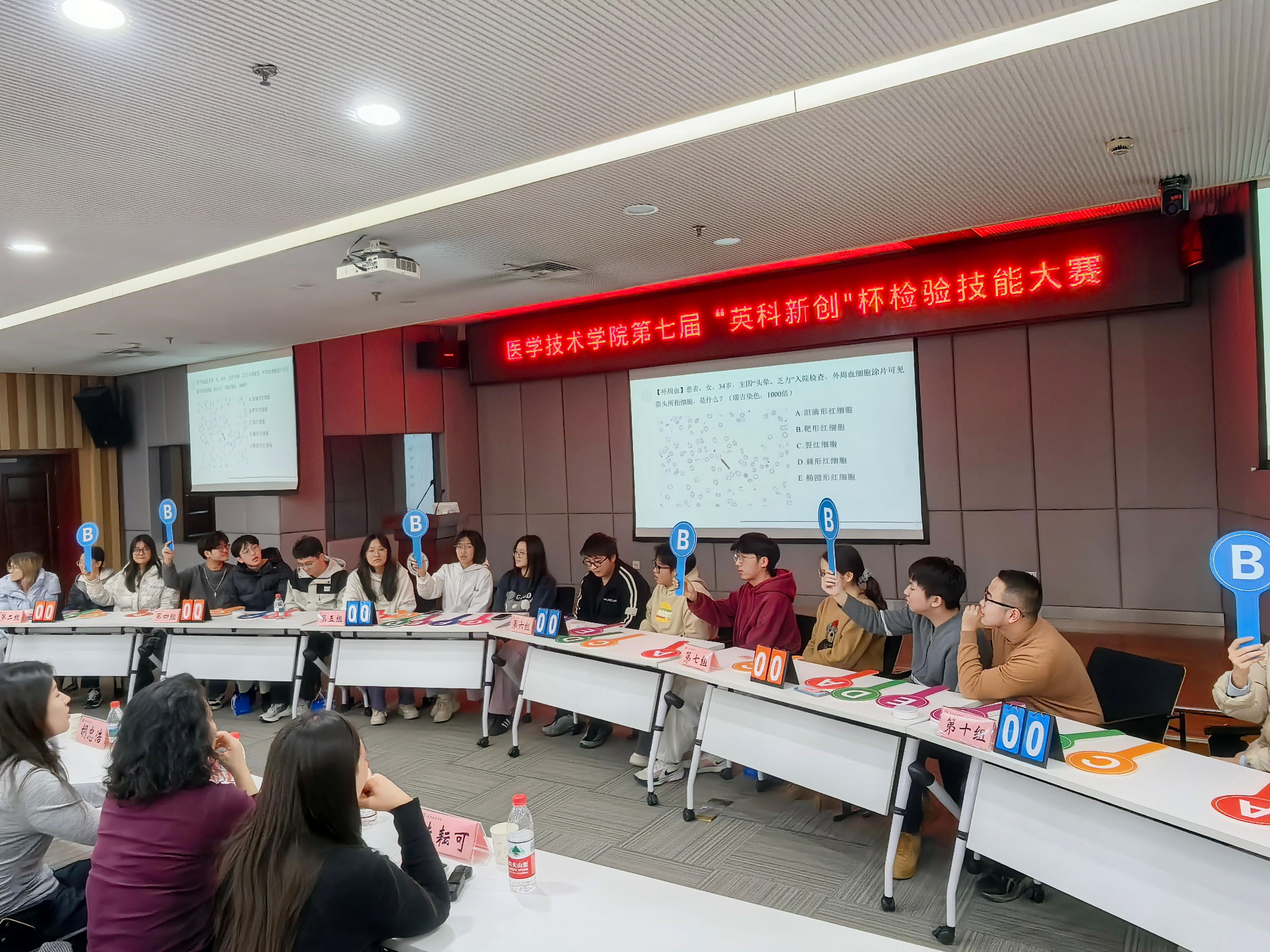 大赛秉持“以赛促学、以赛提技”宗旨,设初赛、决赛、擂台赛三级闯关机制。初赛严审理论与基础实操能力,遴选优秀队伍;决赛聚焦葡萄糖氧化酶法血糖测定、细菌革兰染色等核心技能,选手规范操作、功底扎实,最终六支队伍晋级擂台赛。