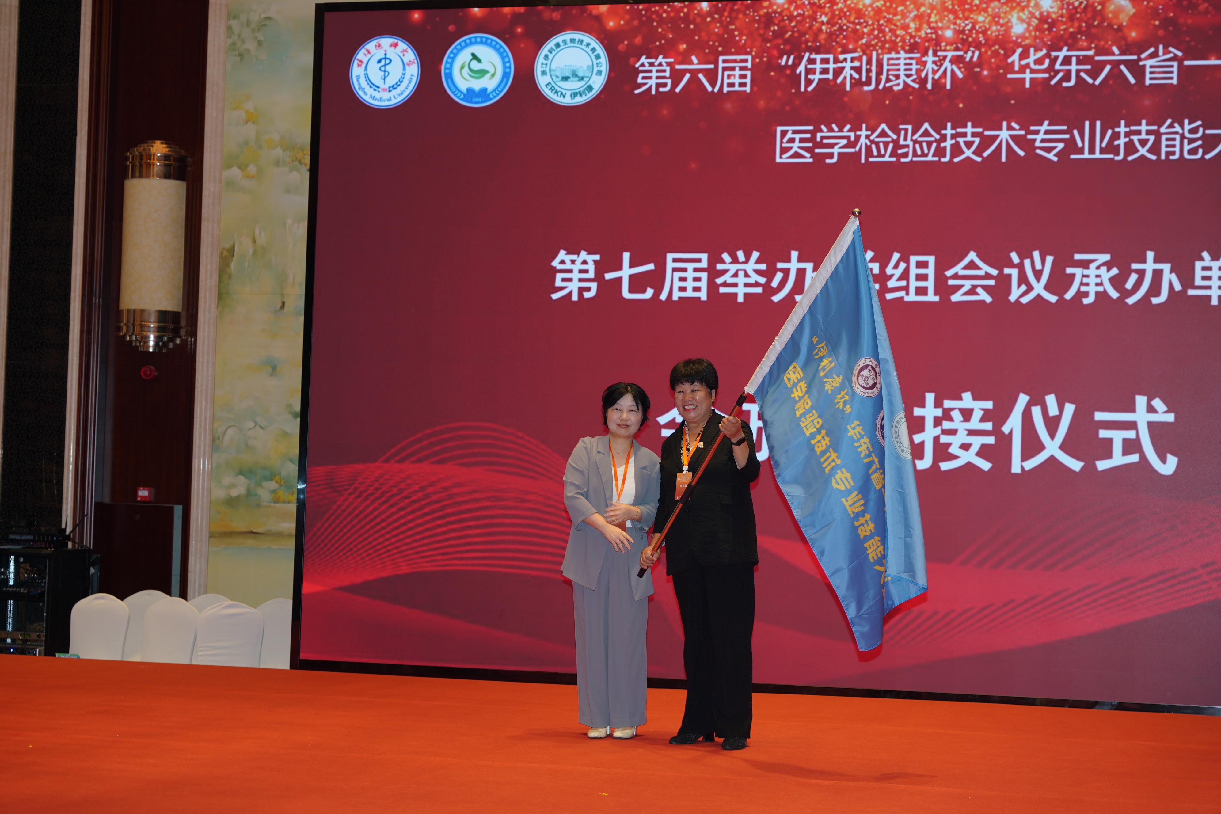 闭幕式上,医学技术学院李洪春副院长受邀参加会旗交接仪式。当象征赛事传承的会旗交至其手中,大会正式宣布 2026 年第七届赛事由我校承办。这不仅是对本次参赛成果的肯定,更是对我校专业建设与办学能力的认可。未来,我校将以此为契机,精心筹备赛事,加强与华东地区高校合作,为推动医学检验技术专业教育发展贡献力量。