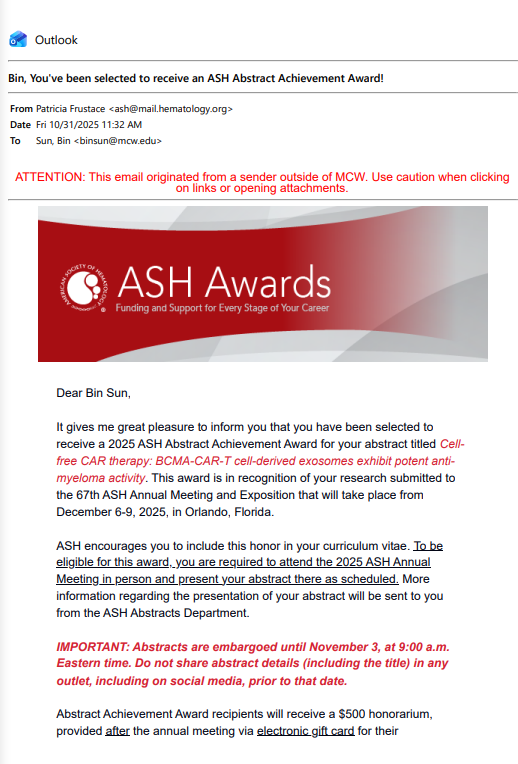 近日,第 67 届美国血液学会(ASH)年会正式公布 2025 年度优秀摘要奖名单。我院齐素华教授课题组 2023 级研究生孙彬,凭借题为《Cell-free CAR therapy: BCMA-CAR-T cell-derived exosomes exhibit potent anti-myeloma activity》(BCMA-CAR-T 细胞展现强效抗骨髓瘤活性)的创新性研究,从全球近万名学者的投稿中脱颖而出,成功斩获优秀摘要奖。