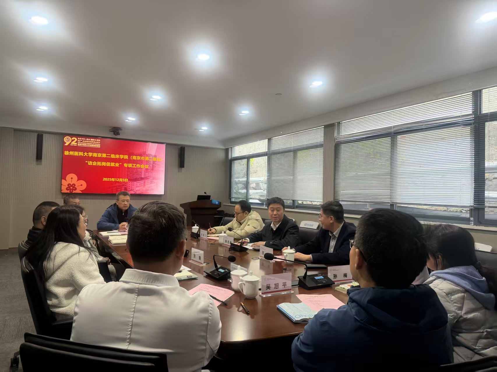 在南京市第二医院,胡忠浩书记详细介绍了学院专业特色与毕业生优势,深入调研医院临床领域用人需求、录用制度、招聘计划及不同岗位的学历、专业要求。双方围绕人才培养方案优化、研究生导师聘任等进行了研讨交流,为学院人才培养与就业指导工作提供了一线反馈。